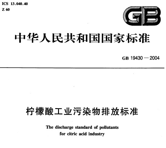 檸檬酸工業污染物排放標準(GB 19430-2004)