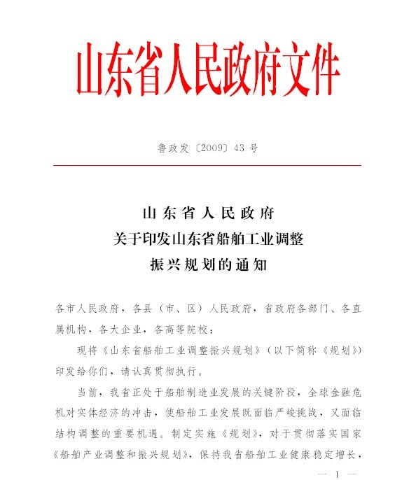 山東省船舶工業(yè)調(diào)整振興規(guī)劃 魯政發(fā)[2009]43號