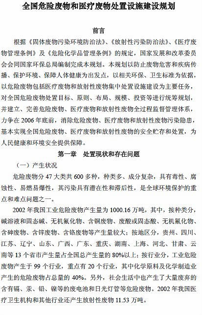 全國危險廢物和醫(yī)療廢物處置設(shè)施建設(shè)規(guī)劃